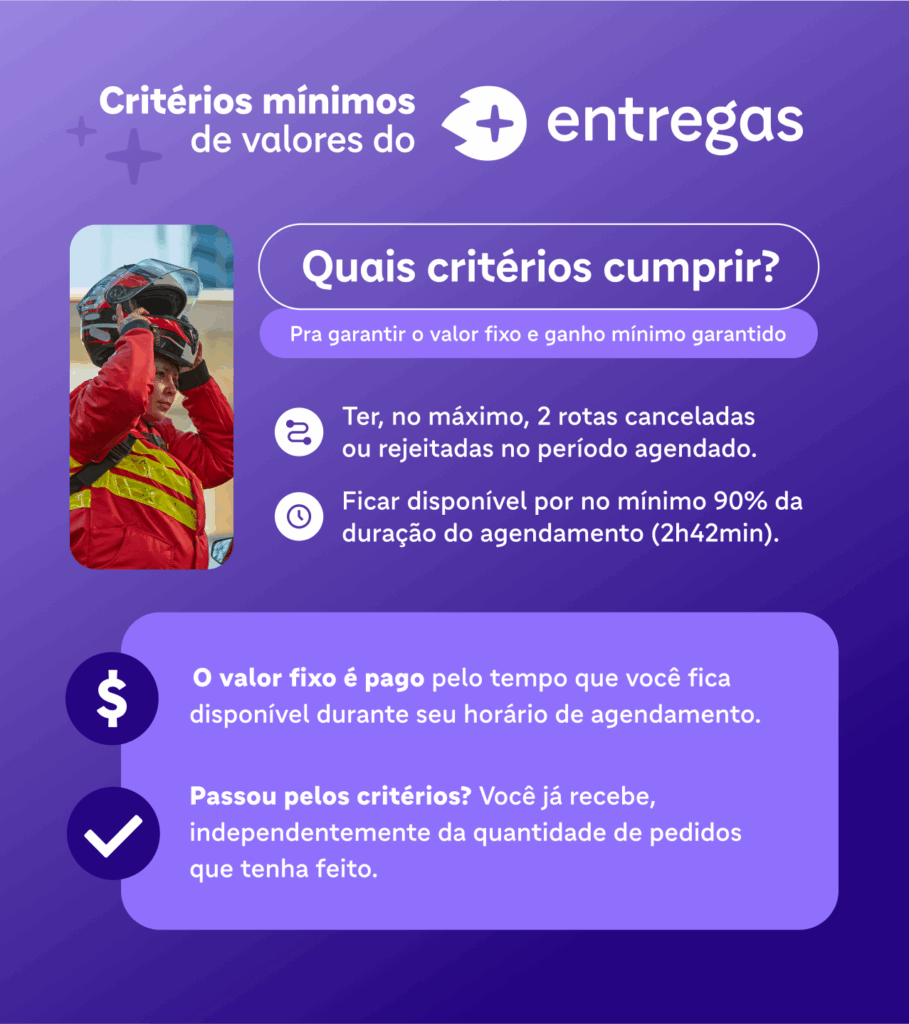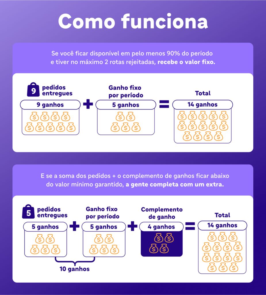 Importante: para receber o ganho fixo por período, é preciso ter pelo menos 2h42 de disponibilidade (90% do período) e no máximo 2 rotas canceladas ou rejeitadas.