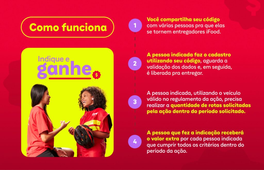 – Ser a primeira vez que seu indicado se cadastra no iFood para Entregadores e no Programa Indique e Ganhe;
