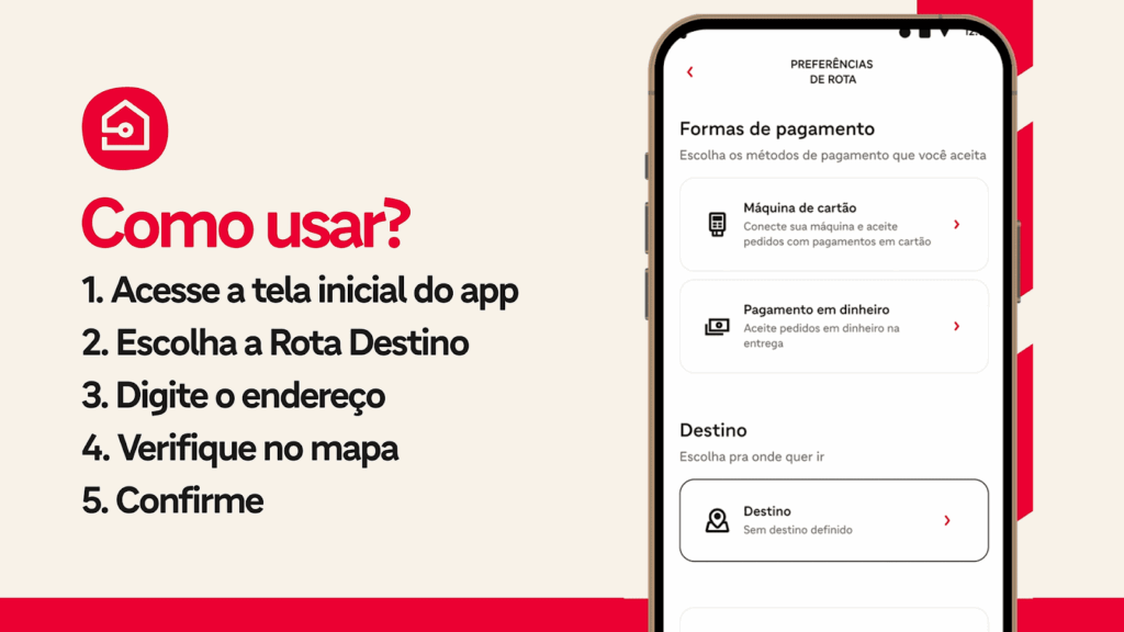 A rota de destino iFood é um recurso dentro do app para entregadores que permite escolher o endereço para onde você quer seguir, seja o fim do expediente ou uma nova região de entregas.