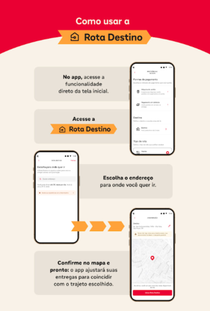 Com a Rota Destino, você escolhe para onde quer ir — seja para casa, para uma nova área de entregas ou para encerrar o dia — e o app só envia pedidos que sigam nessa direção. Assim, cada quilômetro vira chance de faturar sem andar “batendo lata”.