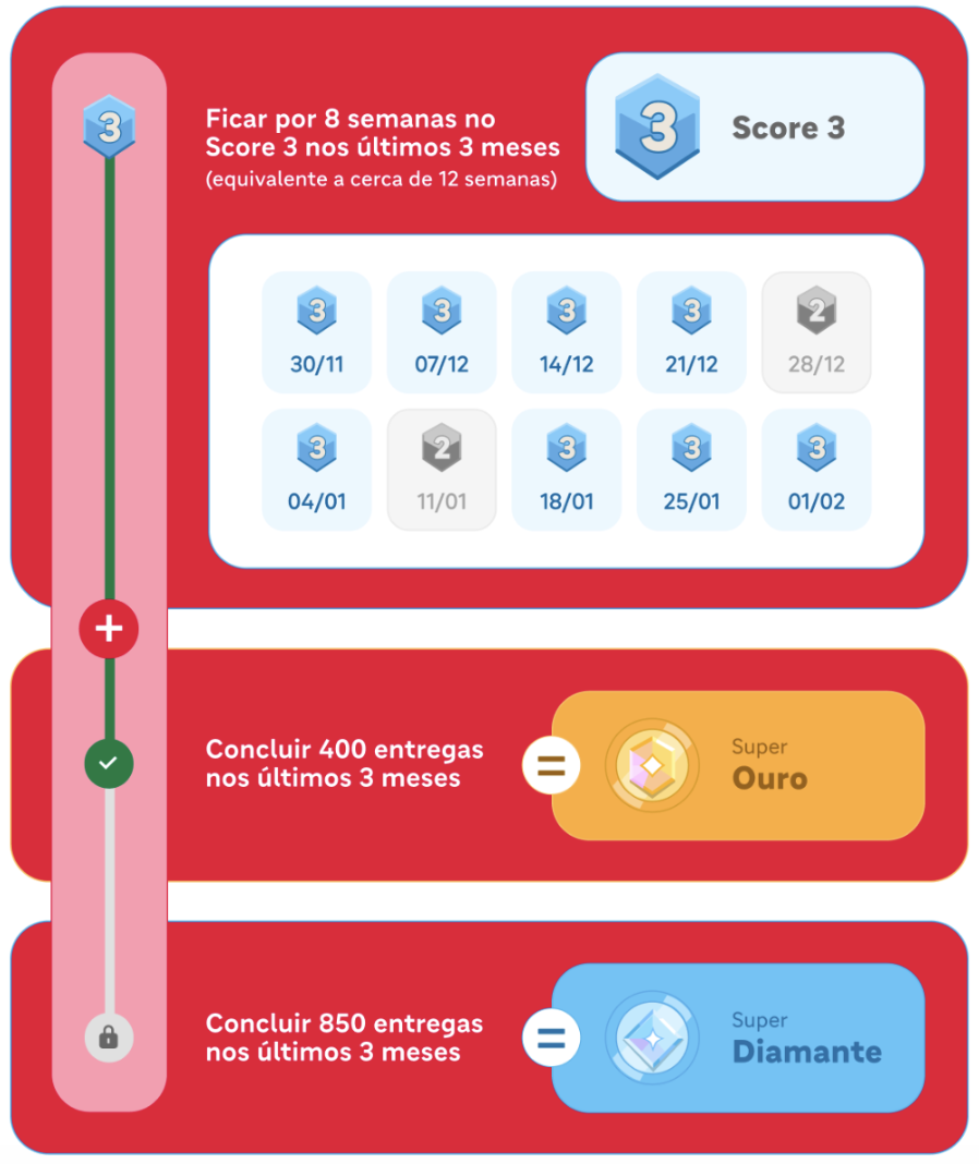 Pra alcançar os níveis Ouro ou Diamante no Super, o primeiro passo é estar no Score 3 por, pelo menos, 8 semanas. Confira aqui todos os critérios 👇
