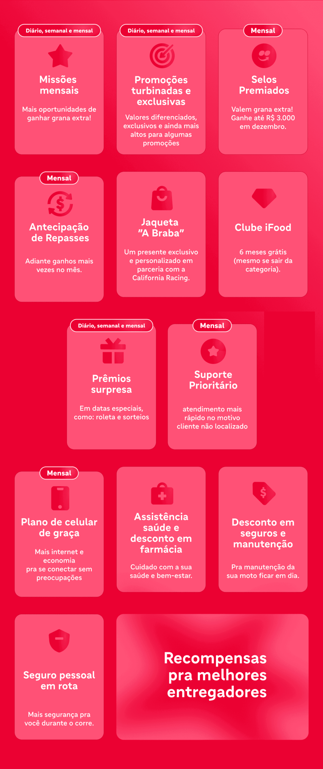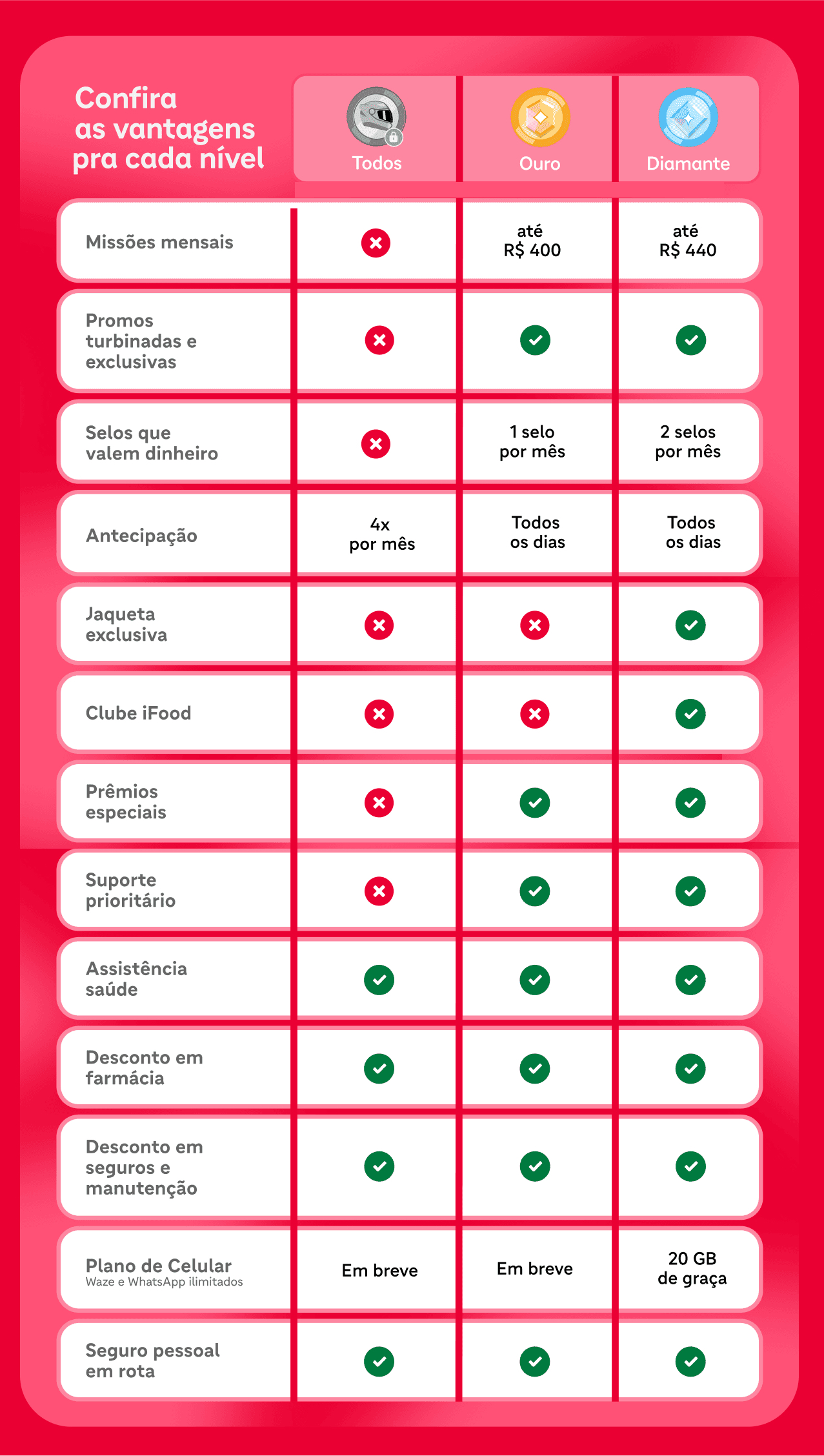 • Diamante: Combustível, Plano Bike Elétrica* *, Antecipação de Repasse, Suporte Prioritário (Cliente não localizado), Seguro Moto, Clube iFood e Jaqueta ou KIT personalizado (corta-vento, camiseta UV e boné personalizados do programa).