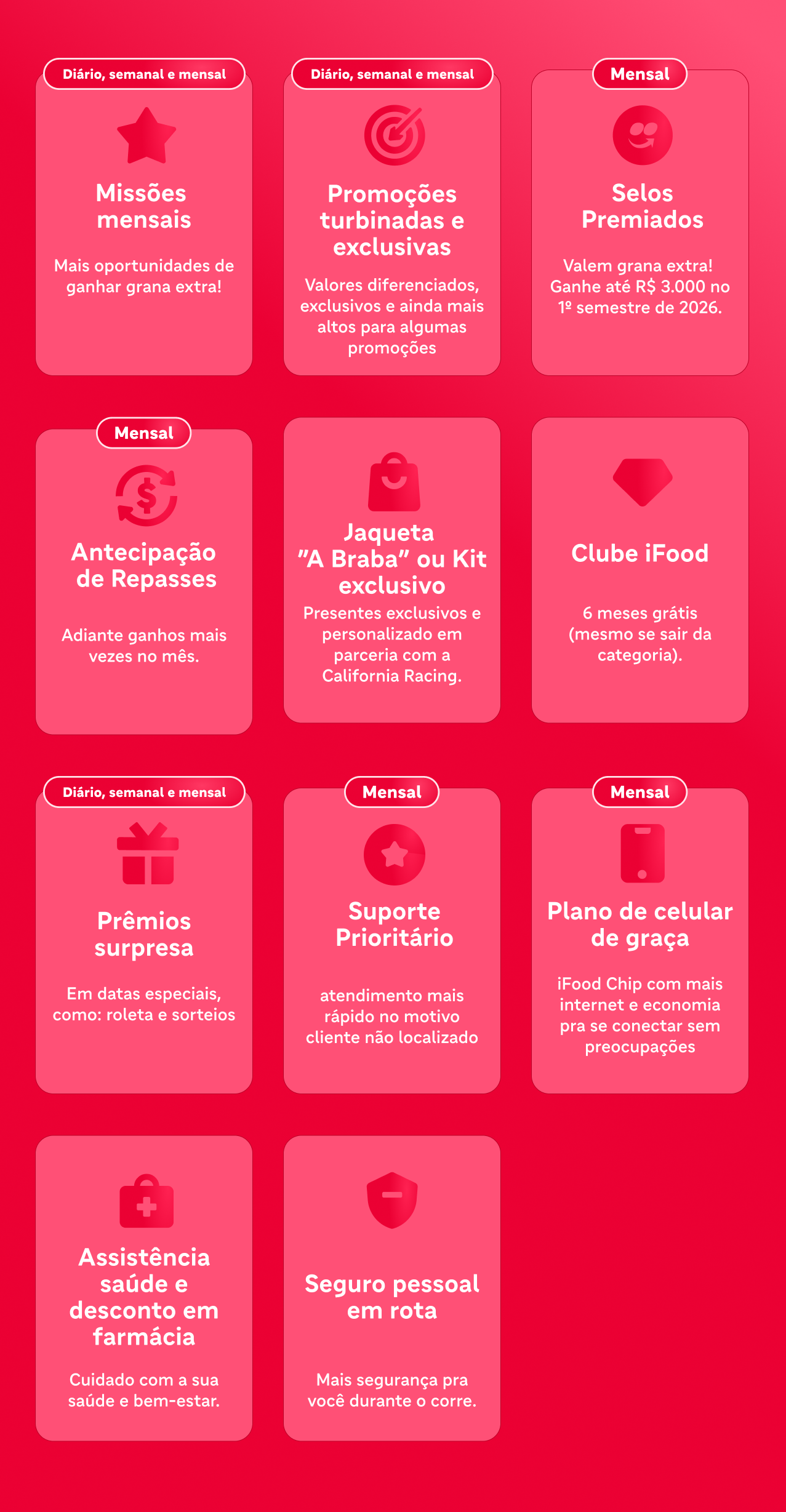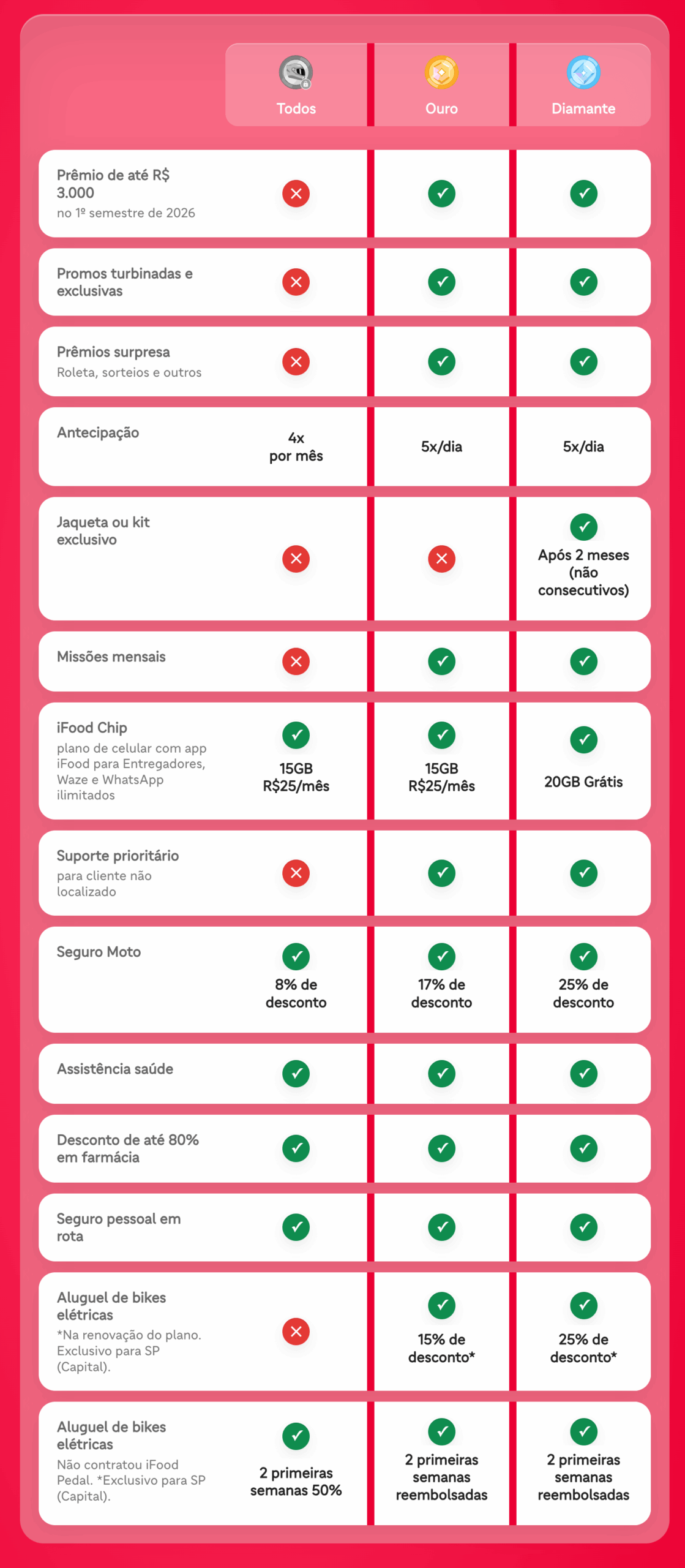 Diamante: Plano Bike Elétrica*, Plano de Celular, Antecipação de Repasse, Suporte Prioritário (Cliente não localizado), Seguro Moto, Clube iFood, Jaqueta ou KIT personalizado (corta-vento, camiseta UV e boné personalizados do programa) e Combustível**.